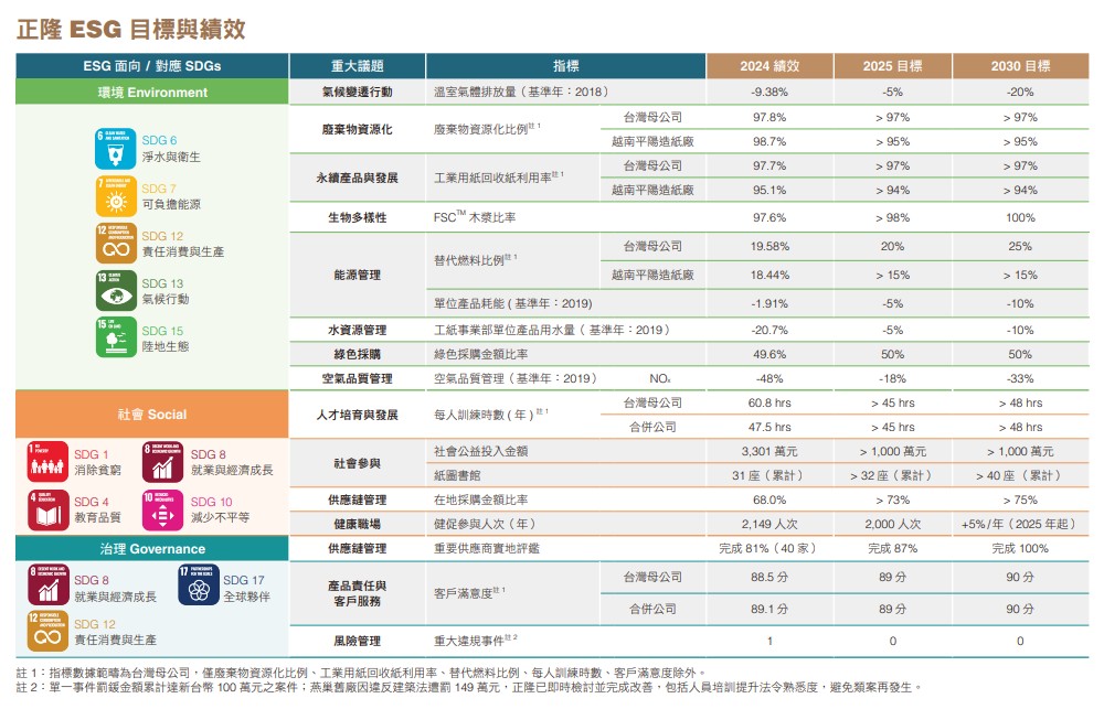 註1:指標數據範疇為台灣母公司,僅廢棄物資源化比率、工業用紙回收紙利用率、替代燃料比率、每人訓練時數、客戶滿意度除外。