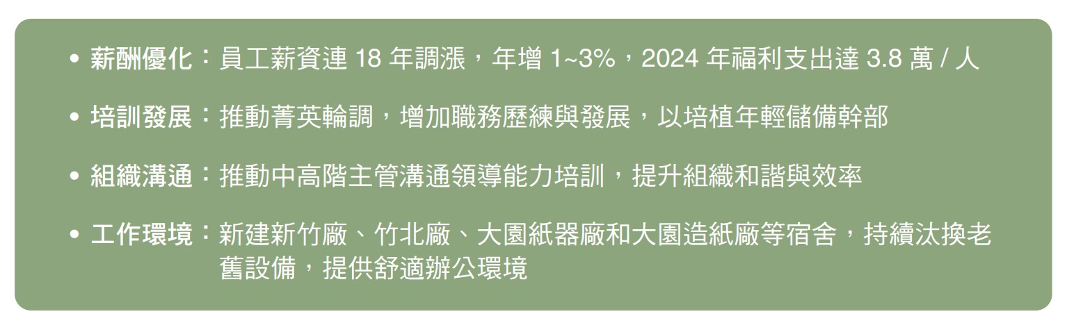 正隆致力於打造讓人才充分發揮的工作環境,並恪遵法規制定完整的員工政策,提供優於法令的福利,如健康檢查與多元假別,確保同仁獲得全方位照顧。此外,公司亦規劃多項措施關懷員工家庭生活,並透過福委會定期會議,持續推動多元共融的福利與關懷方案。2024年正隆每位員工福利支出約3.8萬元,正隆已連續五屆獲頒1111人力銀行「幸福企業-金獎」。