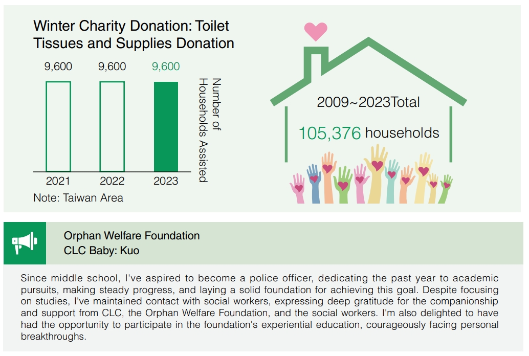 Since its establishment in 1993, the Cheng Huo-Tien Charity Foundation has spared no effort in promoting emergency assistance. Since 2009, the foundation has sponsored the "Winter Charity Donation for Vulnerable Family Program" for 15 consecutive years, in collaboration with the Hon-Dao Senior Citizen's Welfare Foundation, Tayuan Jen-Sho Temple Foundation, Hua-Shan Social Welfare Foundation, Genesis Social Welfare Foundation, and 22 other public welfare organizations. The foundation provides household products from its brands to offer warmth to society during the year-end season, benefiting a total of 105,376 households. In 2023, the Cheng Huo-Tien Charity Foundation invested NT$3.86 million, supporting 72 cases, with a total of 302 cases in the past 4 years (2020~2023).