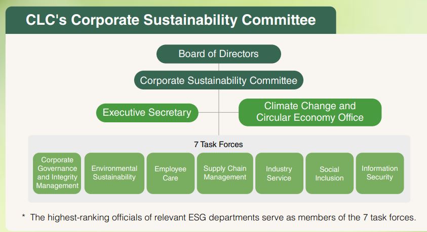 Valuing corporate sustainability, CLC led the industry to set up the CSR Committee in 2013, and in 2021, it was renamed the "Corporate Sustainability Committee," referred to as the ESG Committee. The Chairperson serves as an advisory committee member, and the President chairs the committee. Senior executives from relevant departments serve as ESG task force members to discuss and implement major issues. Addressing climate change and adaptation topics, the committee also established the "Climate Change and Circular Economy Office," with the President as the convener and the head of the R&D Division as the vice convener. The office actively consults external professional organizations, including the Taiwan Green Productivity Foundation, to continuously plan and promote our sustainable transformation.