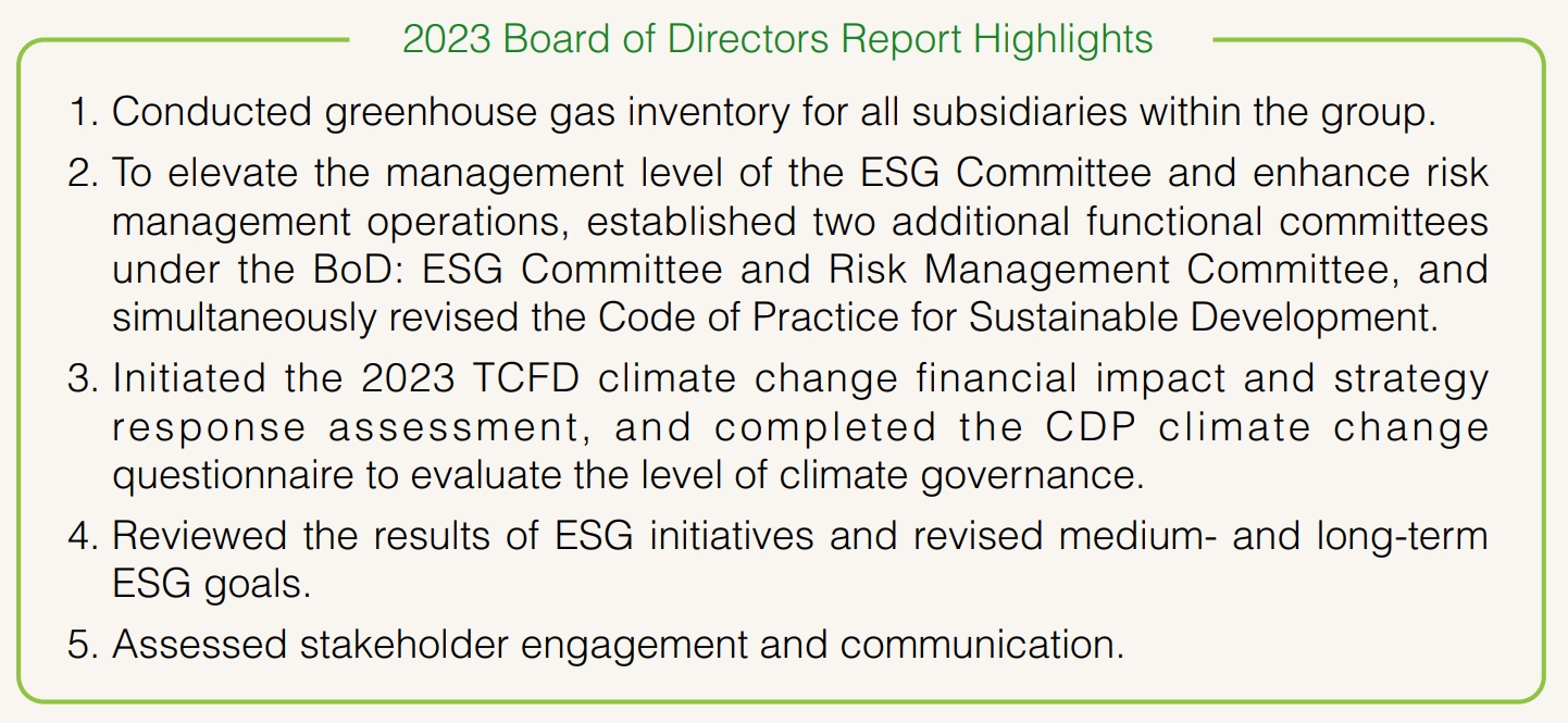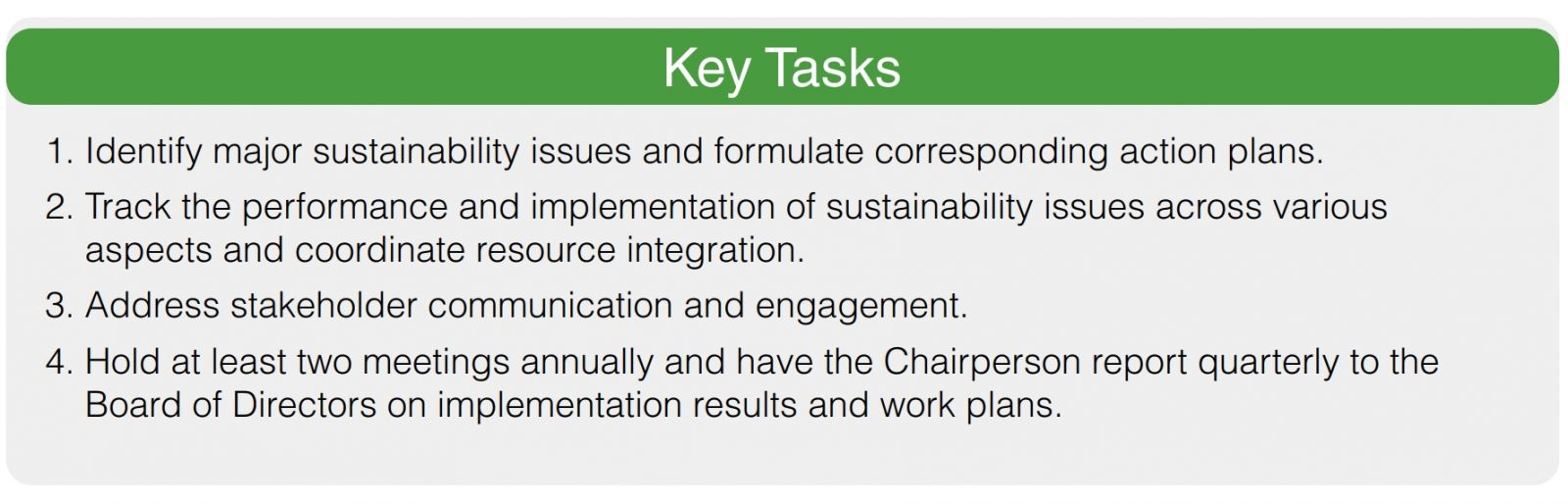 In December 2023, the BoD approved elevating the Corporate Sustainability Committee's oversight level to the Board, making it a functional committee. CLC's President serves as the chairperson, with the heads of the Pulp & Paper and the Containerboard Business Unit, and three independent directors serving as committee members. The Sustainability Department acts as the executive secretary. In addition, ESG Committee are held at least twice annually. In addition to the original task forces, the "Information Security Task Force" was added to strengthen information security management. The task forces hold monthly meetings to track progress and results, reporting to the BoD quarterly. To enhance the directors' expertise in sustainable management and continually enrich new knowledge, the BoD arranges for directors to take the training courses on corporate sustainability development annually.