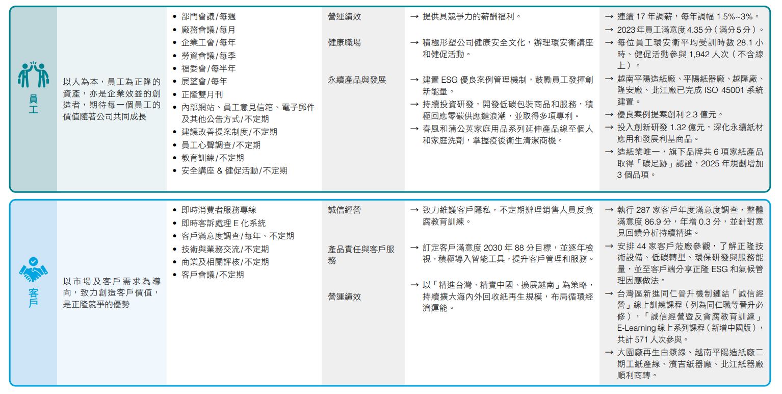 正隆藉由本報告書回應六大利害關係人關注議題,並透過官網和多項平台揭露相關資訊,促進與利害關係人正向交流。正隆ESG委員會每年向董事會報告與利害關係人溝通情形,2023年度議合成果已於2024年3月12日提報董事會,相關內容如下: