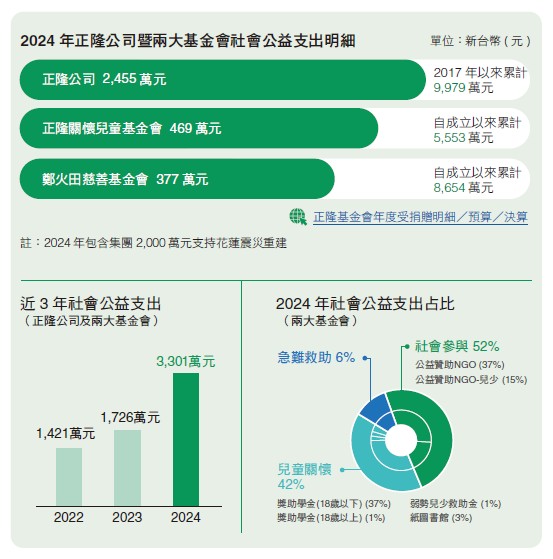 正隆於1993年和2006年分別設立「財團法人鄭火田慈善基金會」及「財團法人正隆關懷兒童基金會」,結合正隆內部資源,積極關懷社會各個角落,扶植弱勢、落實生態保育、推廣教育、促進體育發展、藝文活動,並關懷社區,投入公益30年來,兩個基金會累計投入金額達1億4,207萬元。正隆秉持打造多元共融社會、提升大眾福祉的使命,承諾每年投入超過1,000萬元於社會公益,積極推動永續發展。2024年兩大基金會暨正隆集團共投入社會公益支出3,301萬元,主要項目與預算分配如下: