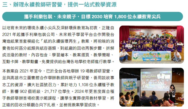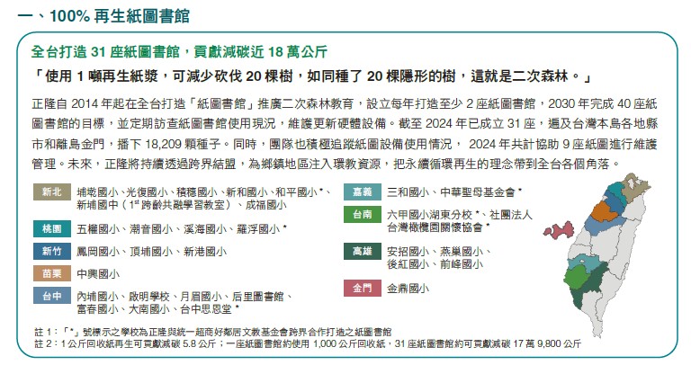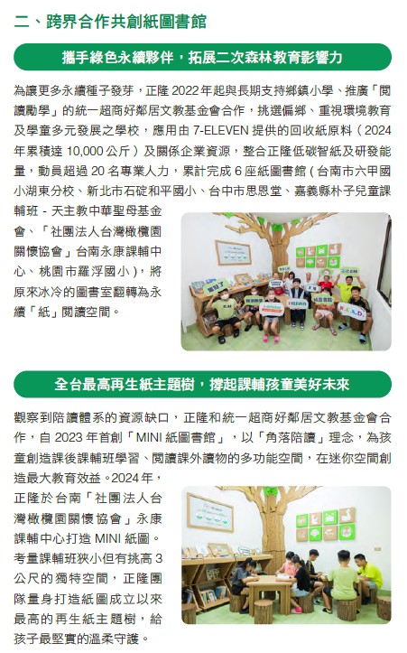 每一張紙都是樹木的延伸,回收紙可以創造二次森林。深信基礎教育是促使資源正確循環再生的動力,正隆積極呼應聯合國SDGs 4優質教育願景,自2014年起在全台打造「紙圖書館」,為偏鄉注入閱讀與環教資源,讓師生得以透過閱讀、認識與接觸紙資源,學會守護與珍惜環境的美好。近年來,正隆積極透過串接多方利害關係人,以共創紙圖書館、推動永續教師研習營、開放工廠參觀等多元創新模式,為社會扎根二次森林永續價值。