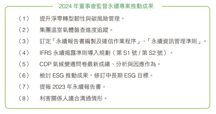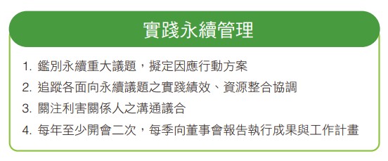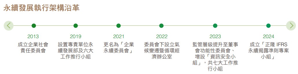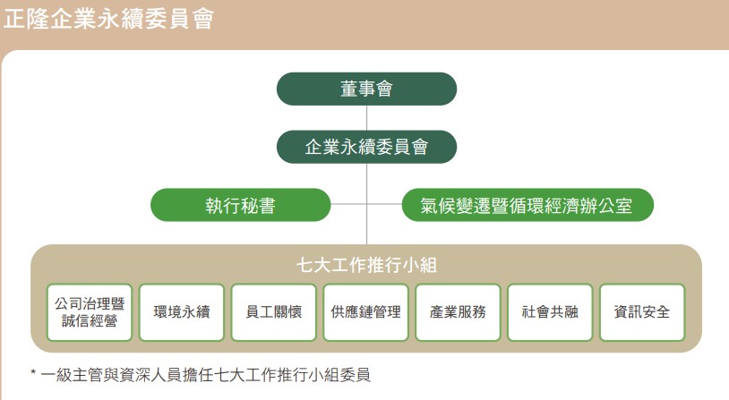 正隆董事會為推動永續發展事務之最高決策督導單位,每年透過企業永續委員會以及委員會執行秘書呈報內容,確認永續專案推動現況,商討管理方針,監督及檢討執行情形。正隆企業永續發展委員會下轄七大工作推行小組,包含公司治理暨誠信經營、環境永續、員工關懷、供應鏈管理、產業服務、社會共融及資訊安全小組,由各相關部門一級主管與資深人員組成, 依部門職能指派 ESG 相關業務,並擴及子公司。委員會下亦設置「氣候變遷暨循環經濟辦公室」,由總經理擔任召集人、研發主管擔任副召集人,並積極諮詢外部專業單位,包含台灣綠色生產力基金會等,工作推行小組每月定期召開會議追蹤工作進度與執行成效,且每季向董事會報告。為提升董事永續管理之專業與持續充實新知,董事會每年皆安排董事進修企業永續發展相關課程。