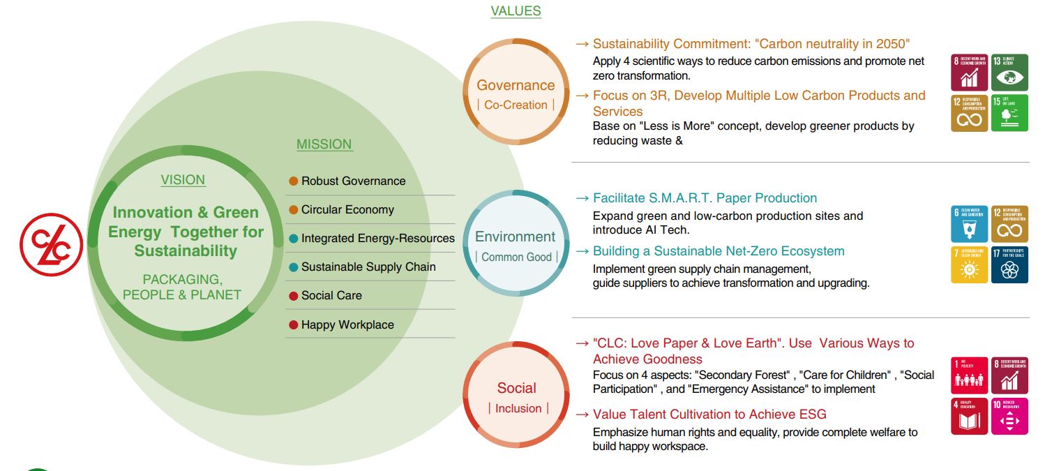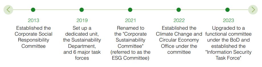 In December 2023, the BoD approved elevating the Corporate Sustainability Committee's oversight level to the Board, making it a functional committee. CLC's President serves as the chairperson, with the heads of the Pulp & Paper and the Containerboard Business Unit, and three independent directors serving as committee members. The Sustainability Department acts as the executive secretary. In addition, ESG Committee are held at least twice annually. In addition to the original task forces, the "Information Security Task Force" was added to strengthen information security management. The task forces hold monthly meetings to track progress and results, reporting to the BoD quarterly. To enhance the directors' expertise in sustainable management and continually enrich new knowledge, the BoD arranges for directors to take the training courses on corporate sustainability development annually.