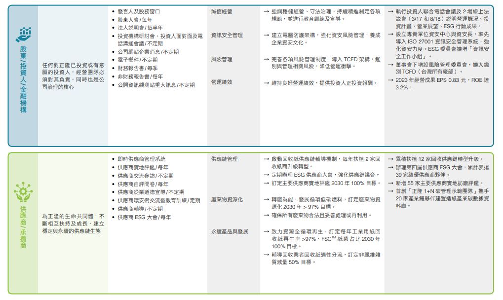 正隆藉由本報告書回應六大利害關係人關注議題,並透過官網和多項平台揭露相關資訊,促進與利害關係人正向交流。正隆ESG委員會每年向董事會報告與利害關係人溝通情形,2023年度議合成果已於2024年3月12日提報董事會,相關內容如下: